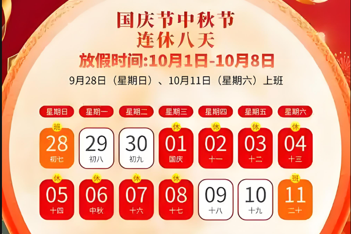 2025年國慶節(jié)、中秋節(jié)連休。根據(jù)《國務院辦公廳關于2025年部分節(jié)假日安排的通知》規(guī)定,